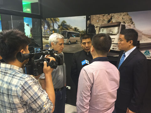 At 20:40 on the evening of September 23rd, Warner Cuny, Minister of foreign affairs of Bolivia, came to the exhibition and visited the China National Heavy Duty Truck Exhibition hall. Warner Cuny learned Sinotruk products and had a cordial conversation with Sinotruk (Hongkong) Limited chief representative of Asian American Hou Yongjun.
